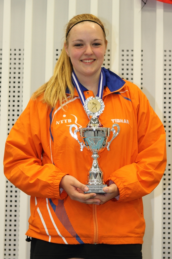 Angelique, ja van haar is bij de TTSD al langer bekend dat ze internationaal mee kan. Dit toernooi in Denemarken was weer een goede graadmeter voor haar internationale niveau. In het team toernooi bleek ze aardig in vorm, want ze won 9 van haar 10 wedstrijden. In haar poule van het enkelspel kwam Angelique ook weer het meisje tegen dat van haar wist te winnen in het teamtoernooi. En de tweede keer was Angelique gewoon net iets beter en mede daardoor won ze haar poule zonder een wedstrijd te verliezen. Vanaf de kwartfinale was er een k.o. systeem. Maar er was er maar een die alle tegenstanders een k.o. gaf met haar harde fh en bh spin en zodoende won Angelique gewoon het 6 nations kadetten toernooi, zie de foto hieronder!